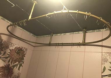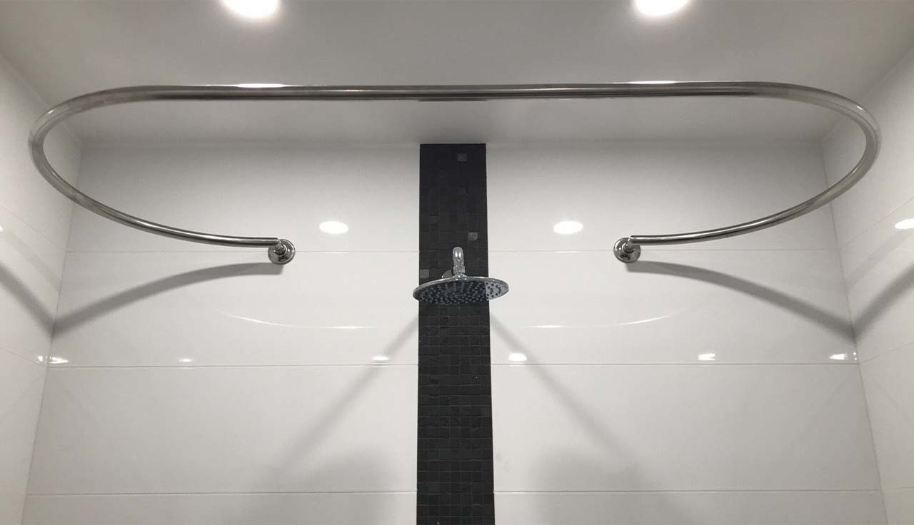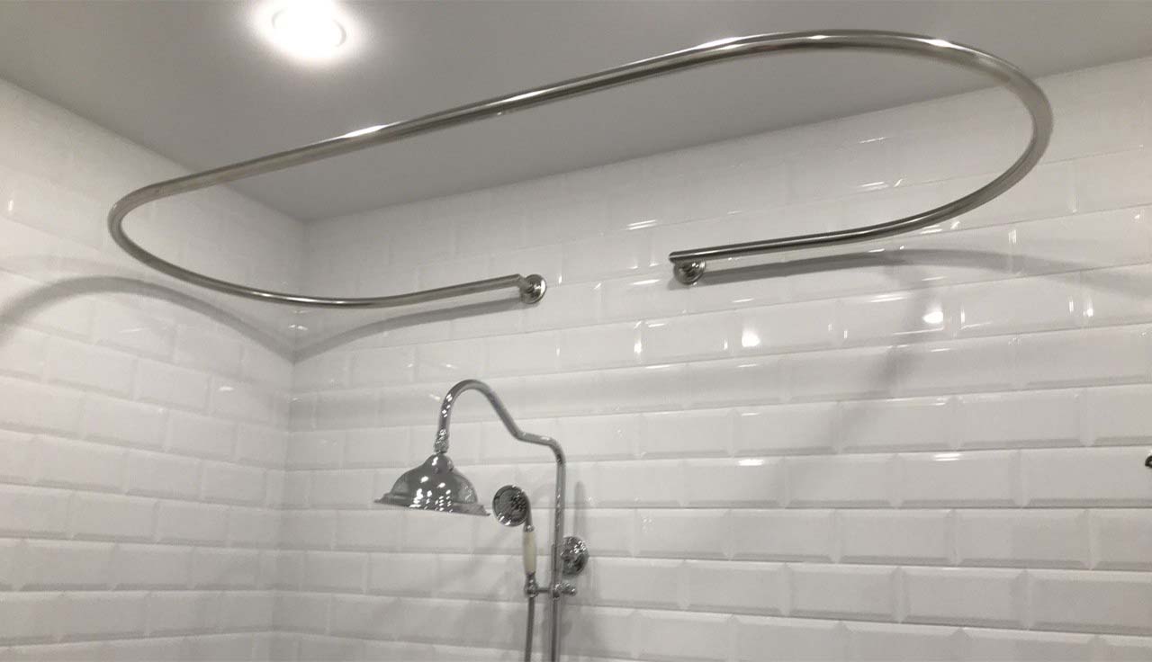 Сварной карниз с разрывом, как правило, крепят на две точки в одну стену, где установлен смеситель, подкову используют для пристенных овальных ванн, а сборный овальный карниз, обычно, выбирают в целях снижения стоимости конструкции и, чаще всего, крепят в потолок.