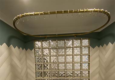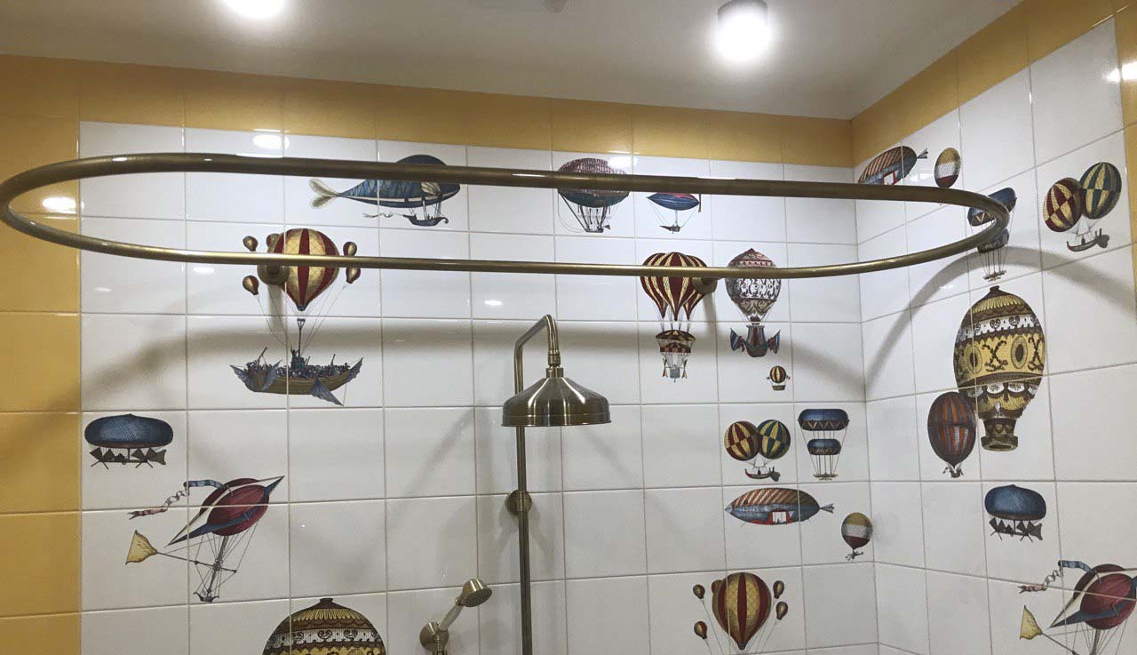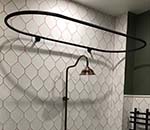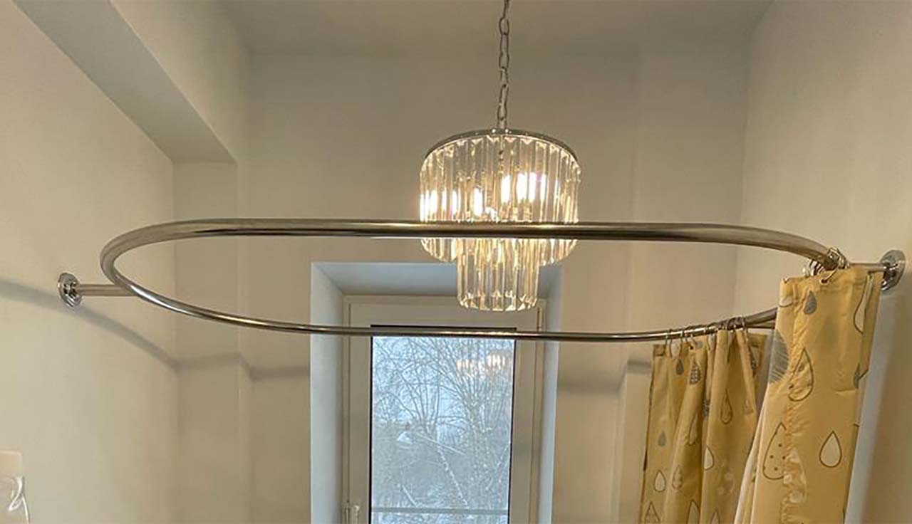 Карниз в форме замкнутого овала позволяет закрыть ванну шторками с трех сторон и разместить душевую стойку в середине.