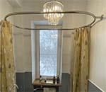 Карниз в форме замкнутого овала позволяет закрыть ванну шторками с трех сторон и разместить душевую стойку в середине.